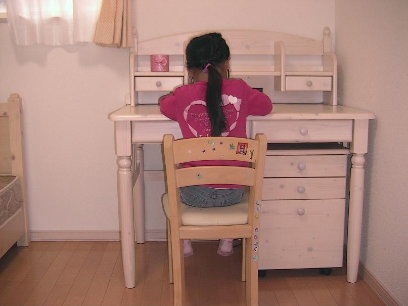 我が家の長女も、ついに小学生になるので・・・。 9月には、ベットを。 そしてつい先日学習デスクを購入しました。 彼女の部屋(というか2階全て)は白で統一されているので、ベットも机も白っぽい物が欲しかったのです。 かつ、長女のリクエストが『お姫様みたいなのが良いv』でした。 学習デスクにいたっては、本当にピンからキリまでのお値段がするので・・・。 グルグルと色々な家具屋を見て周り(こういう事、大好きです^^)、一軒の店で『コレだ!』と思う品を見つけたのです! しかし・・・? 白に塗装されたその机は素敵に可愛い女の子ちっくな造りをしていまして、セットで本棚とベットと服掛けも売られていたんです。 見た目の判断で『これはきっとお高いぞ・・・!』と思いつつ、傍に居た人の良さ気な店員さんに『お幾らですか?』と尋ねましたら・・・ふふふ。 「ええと・・・机のみで6万円。上に置く棚で3万円。椅子が5万に・・・机のセットだけで15万になります。」 ぎゃあああ・・・た、高い・・・。 「ええ、女の子のお母様は一目惚れされる事が多い品なんですけれどね。お値段がちょっと張りますから・・・。」 ちょっとなのか?いやいや。それって、かなり高いよね・・・? 私的には娘の為に奮発しても構わないという思いがあれど、財布の紐が固い旦那さんは、絶対に首を縦には振らないだろうし・・・。 『ありがとうございました』と言って、残念無念な想いを抱きつつ帰宅。 世に言うプリンセス型デスクというものは、店頭品では絶対にお安くは手に入らないぞ・・・と私は確信。 それから約2ヶ月、ずっとどうしようかな~・・・と迷いつつも、ついに購入を決意したのがネットで通販していた学習デスクでした! お値段はかなりリーズナブルで、かつ組み立て式ではありましたが、今日お品が届き組み立て完了! うふふvvやはりお値段なだけに、細かい部分は「う~ん」という感じですが、視覚的には大満足☆ 机たるもの、勉強が出来ればいいのだ^^ いや、その前に長女がちゃんと其処で勉強したいと思ってくれればそれでいい! また一つ増えた入学前アイテムに、ホクホク顔の私と長女なのでしたvv (あ・・・写真の中にある椅子は、私の化粧用椅子です。今度は椅子を買わなくちゃvv)